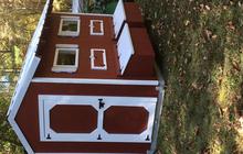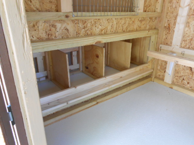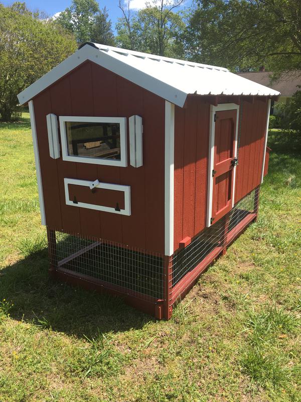 Structure is framed with pressure treated wood.Overall height is approx. 72". Floor is covered with 1/2" pressure treated plywood with a polyvinyl glassboard on top for easier cleaning. Roof is insulated with 1/2 inch foil insulation.for cooler temps in the summer. Hinged wire screen door on front and back for ventilation. Body is of 3/8" Smartboard. Window is made of plexiglass. Coop has three nest boxes.There is an electrical fixture inside so that can be used for light and warmth.Comes painted or stained. Your choice, of color.