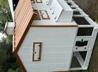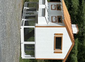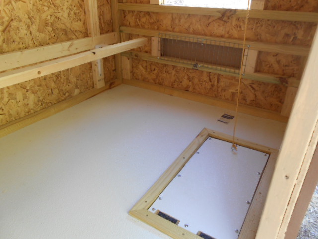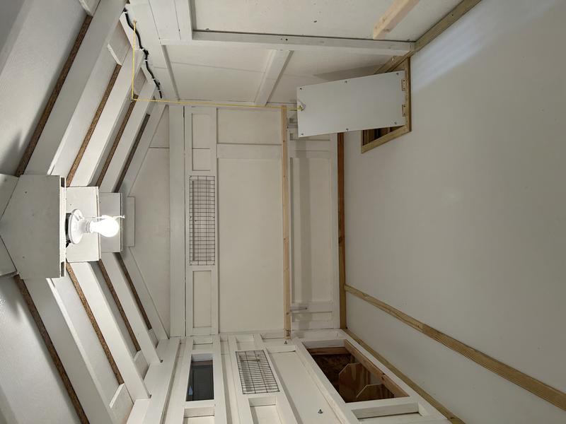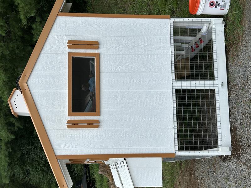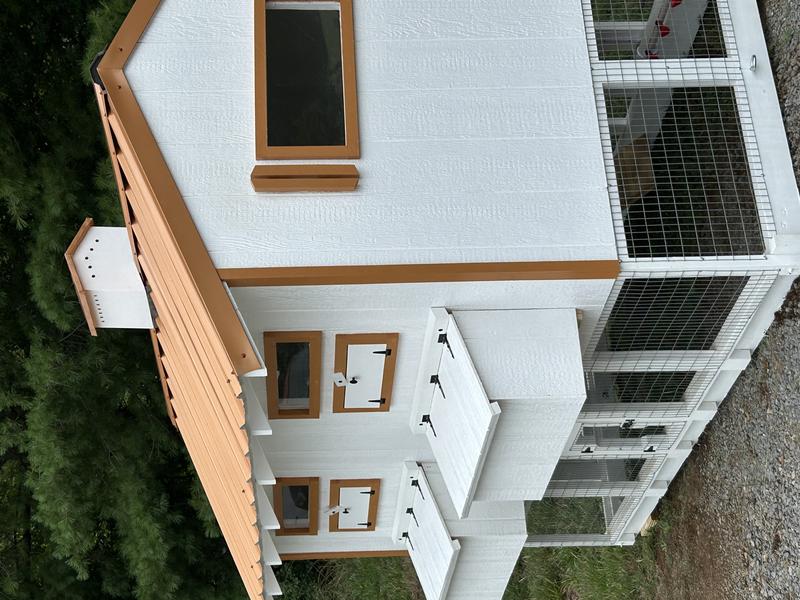 Coop is made of pressure treated material where exposed to the elements.Roof is insulated to prevent condensation. Exterior is Smart board siding. Roof is metal with baked on paint from Sherwin Williams. Floor is pressure treated with polyvinyl over the top for easy cleaning. It has 4 vents for fresh air. Extra lighting on the sides doubling the light capacity.