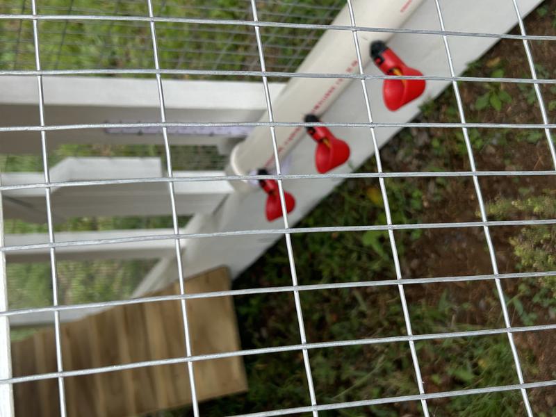Coop is 5' wide and 9' long. Approximately 78" high. It has run out doors for the chickens to range away from the secured area if desired. Coop comes with water drinkers to accommodate the entire flock.Attached with a five gallon capacity pail for several days of water.